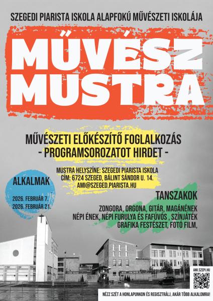 A Szegedi Piarista Iskola Alapfokú Művészeti Iskola idén 2026. február 7., és február 21. szombati napok délelőttjén még két alkalommal várja a művészetek iránt érdeklődő diákokat. A Művész Mustra programsorozat alkalmával különböző művészeti tevékenységekben próbálhatják ki tehetségüket a jelentkező gyermekek és fiatalok, akár az egyik foglalkozásról a másikra is átjárva, szabadon. Az igényes és ingyenes zenei-, képzőművészeti és művészeti foglalkoztatókon a Szegedi Piarista Iskola művészetoktató tanáraitól tanulhatnak.